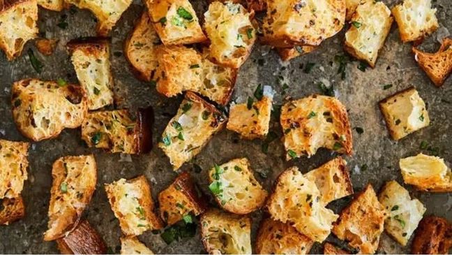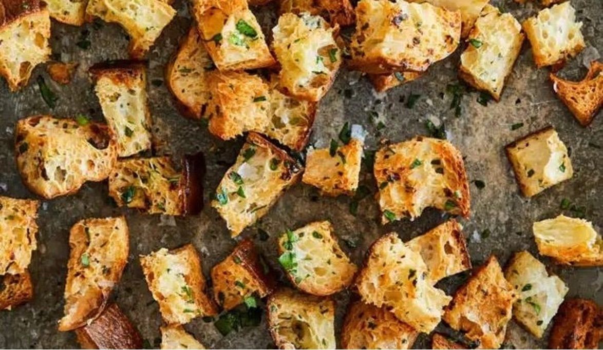يُقطع الخبز إلى مكعبات صغيرة، ثم يُحمص في الفرن مع القليل من الزيت والثوم حتى يصبح مقرمشًا ويضيف قوامًا مميزًا للسلطة.