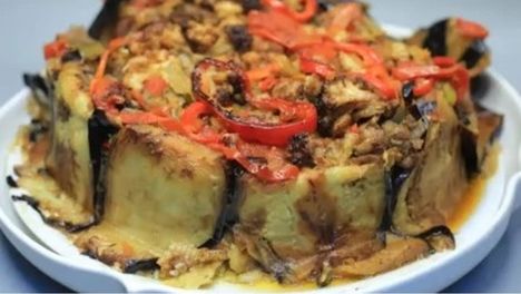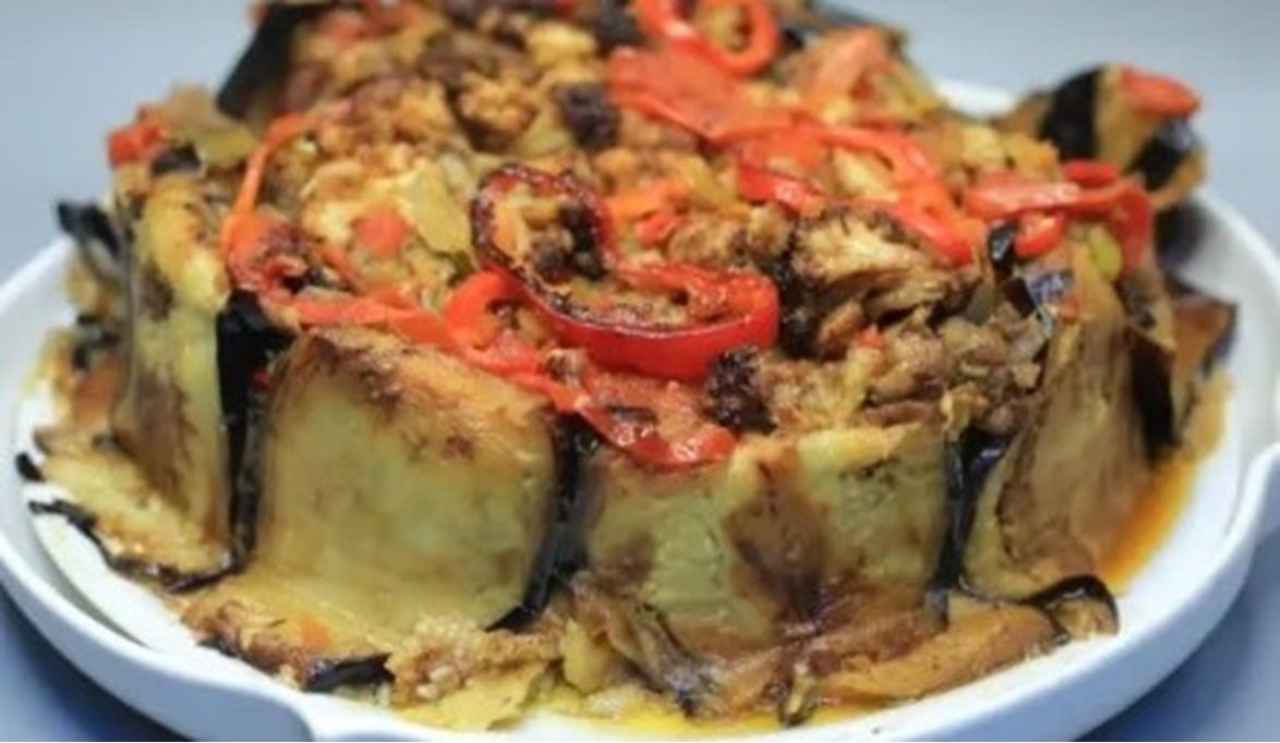 في وعاء مناسب، رص حلقات الطماطم والباذنجان المقلي على حواف الوعاء.