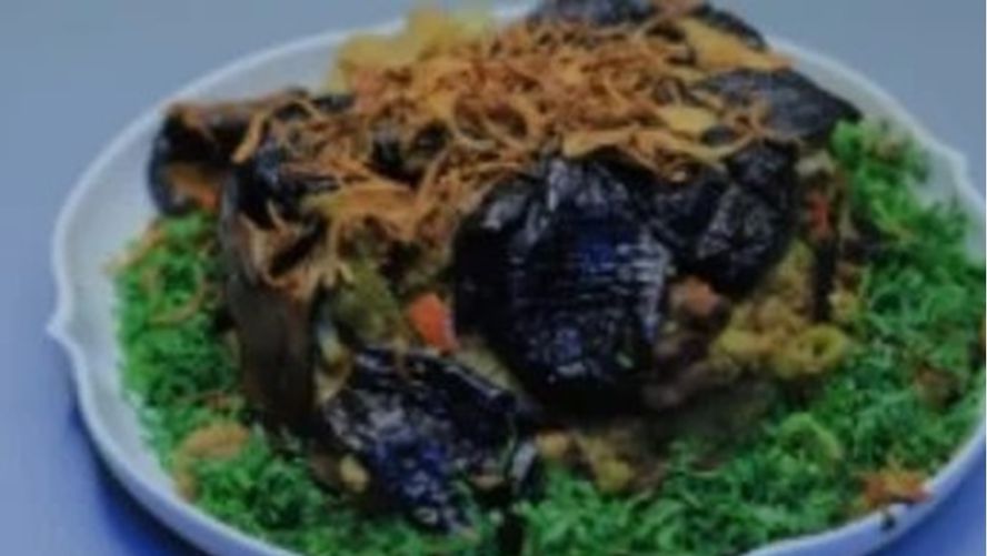 في وعاء كبير، يُرص الباذنجان المقلي والقرنبيط المقلي بشكل مرتب في قاع الوعاء، ثم يُضاف الأرز فوقهم.