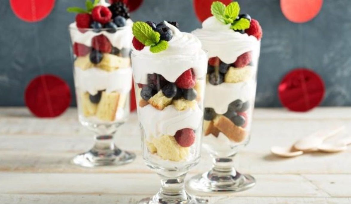 اغسلي الفواكه جيدًا وقطّعيها إلى قطع صغيرة متناسقة.قطّعي الكيك إلى مكعبات صغيرة وضعيها في قاع الكوب كطبقة أولى.