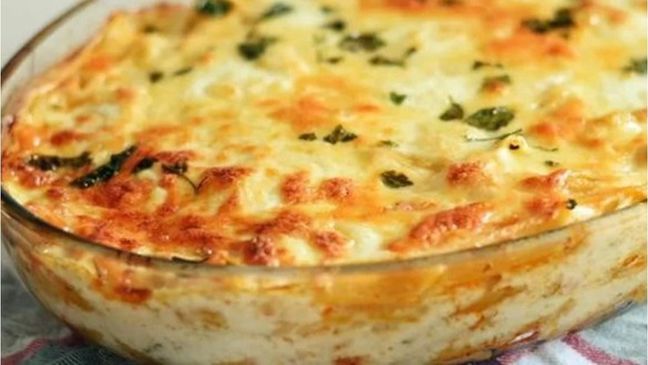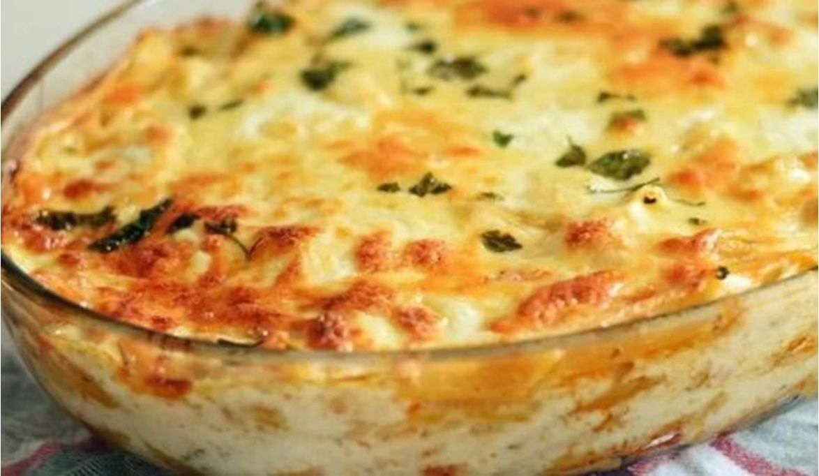 ثم يضاف خليط البشاميل على الوجه ويدخل الفرن حتى تمام النضج وتقدم.