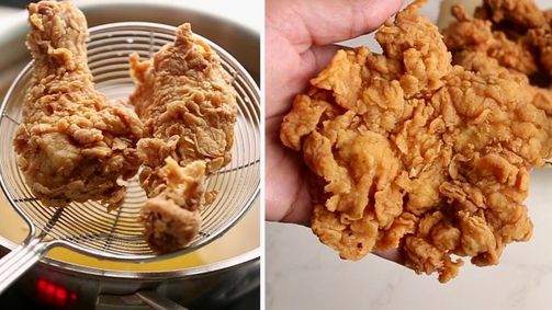 _ نضع الزيت الغزيرة في مقلاة كبيرة على النار، وبمجرّد أن يسّخن نضع قطع الدجاج المغمّس بخليط الطحين حتى يُقّلي يصبح مقرّمشًا ذا لون ذهبي، ويتم تناولها بجانب البطاطس المقليّة.
