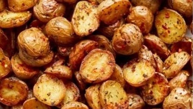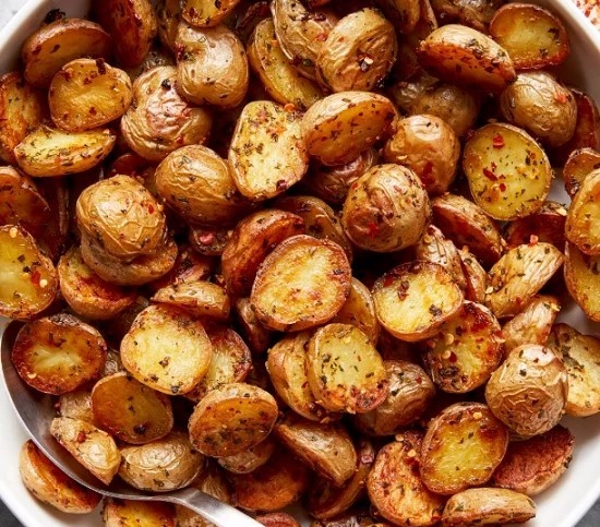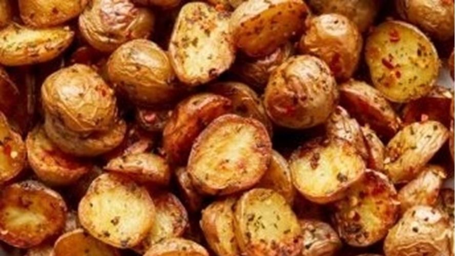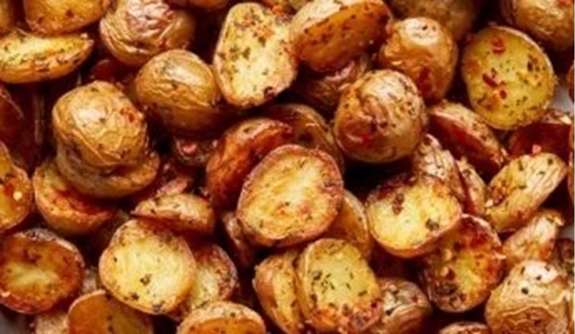 التحميص: تُرص البطاطس في صينية فرن وتُدخل إلى فرن مُسخن مسبقًا على درجة حرارة 200 مئوية لمدة 25–30 دقيقة حتى تنضج وتتحمر.