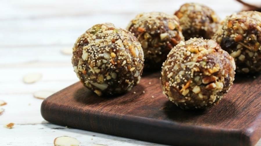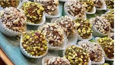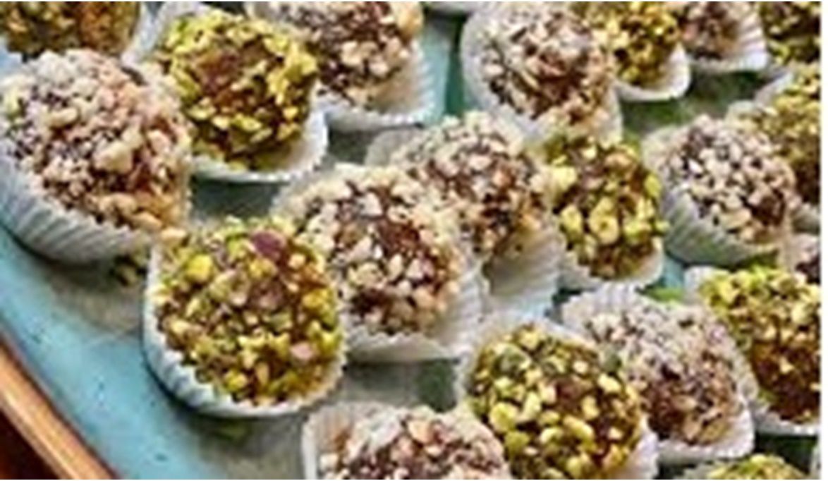 - نغطس كل كرة بدبس التمر ثم نوزع من المكسرات المتنوعة المطحونة وبسكويت اللوتس المطحون بحسب الرغبة.