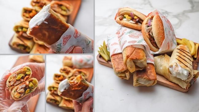 توضع الشاورما مع الخضار في الخبز العربي وتقدم ساخنة.