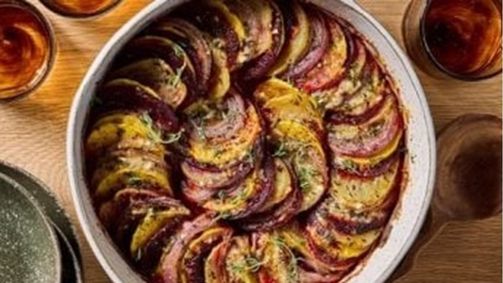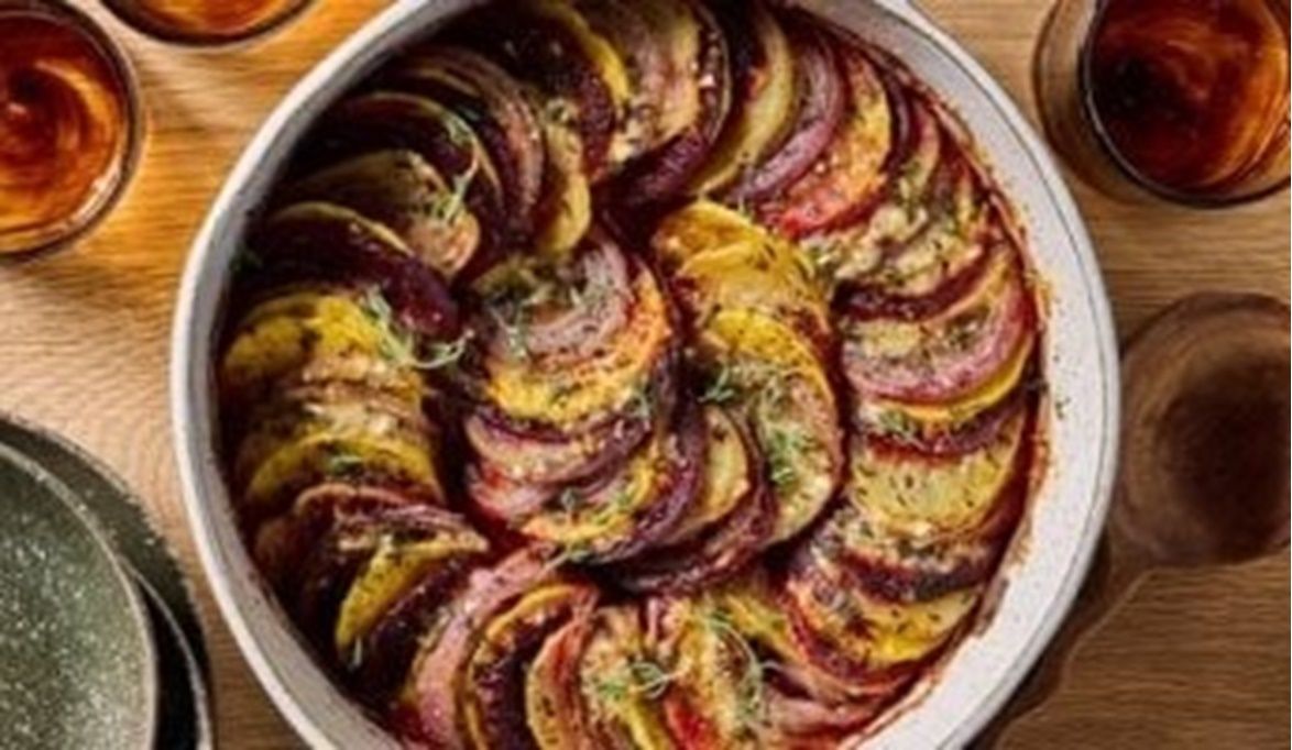 يتكون هذا الطاجن من طبقات متنوعة من القرع، البطاطس، البنجر والبصل الأحمر، حيث تمتزج الخضراوات مع زيت الزيتون والثوم أثناء الخَبز لتمنح نكهة عميقة وشكلًا جذابًا. ويُعد خيارًا مثاليًا لعشاء دافئ في الليالي الباردة.