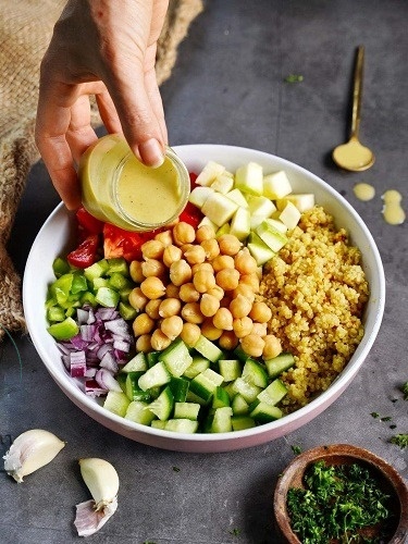 بالفيتامينات الضرورية.خضروات مقطعة مع حمص أو زبادي