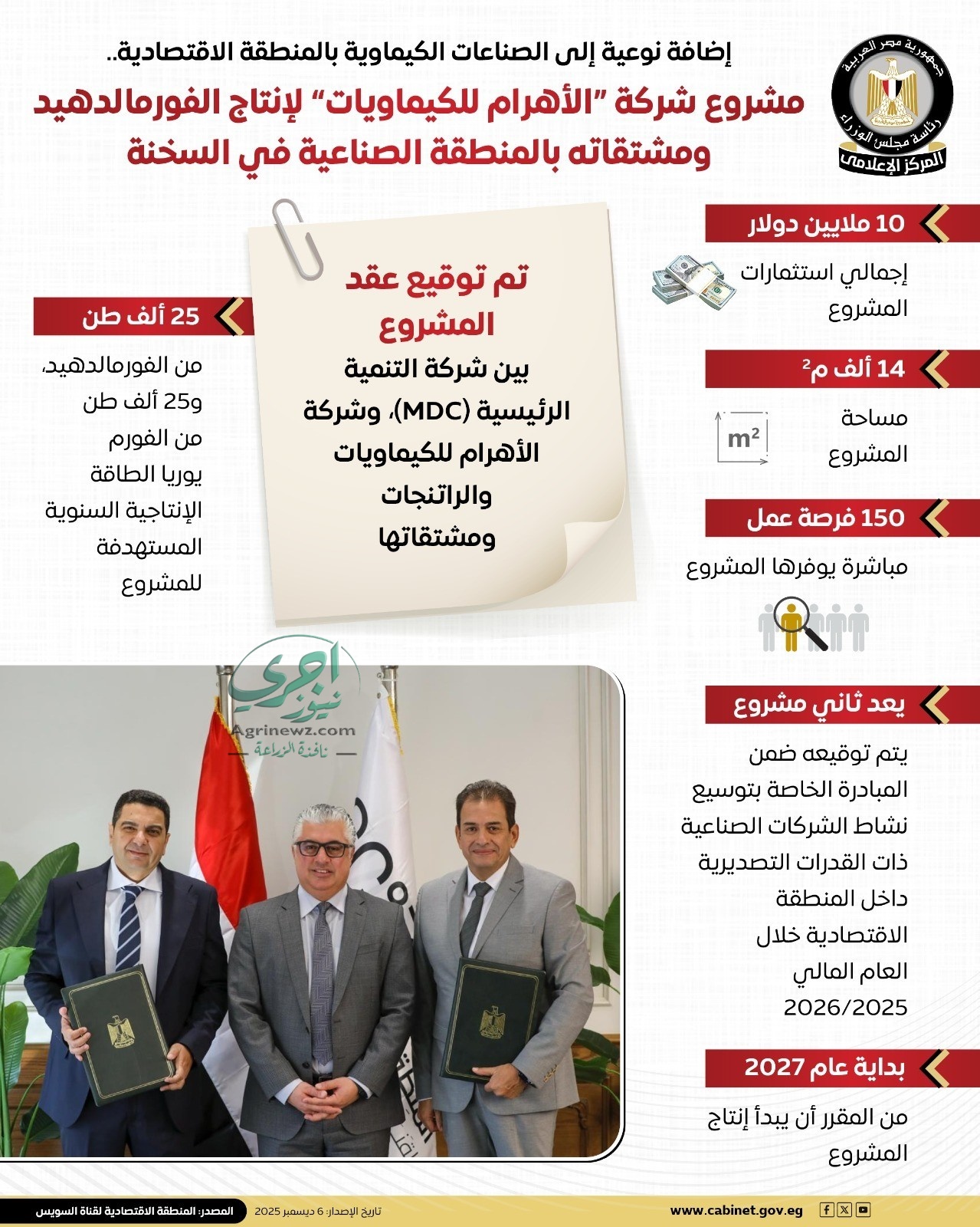 وتم الاتفاق بين شركة التنمية الرئيسية (MDC) وشركة الأهرام للكيماويات والراتنجات ومشتقاتها على تنفيذ المشروع الذي يمتد على مساحة 14 ألف متر مربع، ويوفر نحو 150 فرصة عمل مباشرة.