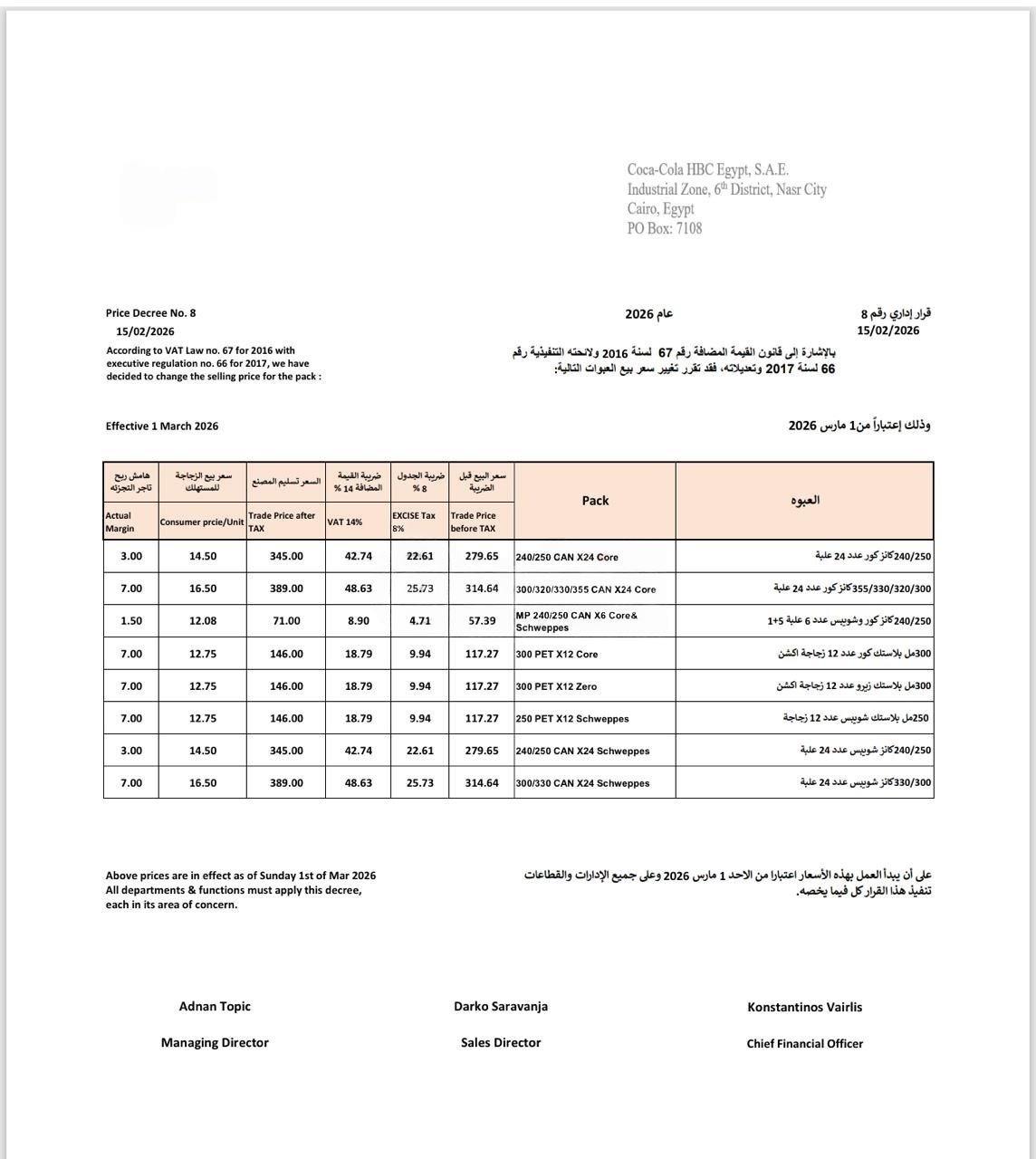 أعلنت شركة كوكاكولا - مصر عن رفع أسعار منتجاتها في الأسواق المصرية اعتبارًا من شهر مارس المقبل 2026، وذلك وفقًا لمستند رسمي أرسلته الشركة إلى التجار