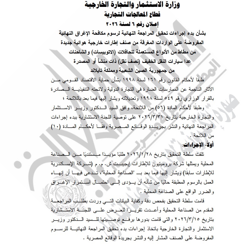 أعلنت وزارة الاستثمار والتجارة الخارجية، ممثلة في قطاع المعالجات التجارية، اليوم الخميس 2 إبريل 2026، بدء إجراءات المراجعة النهائية لرسوم مكافحة الإغراق المفروضة على واردات الإطارات الهوائية الجديدة المستخدمة في الحافلات والشاحنات، ذات المنشأ أو المصدرة من جمهورية الصين الشعبية ومملكة تايلاند.
