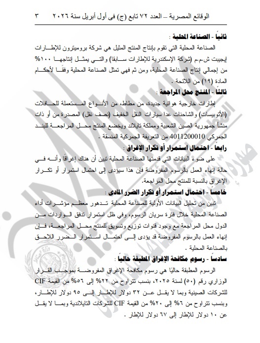 تلقت وزارة الاستثمار طلبًا من الصناعة المحلية، ممثلة في شركة بروميتيون للإطارات إيجيبت (شركة الإسكندرية للإطارات سابقًا)، في 28 يناير 2026، طالبت فيه بمد العمل بالرسوم الحالية، محذرة من أن إنهاءها قد يؤدي إلى استمرار أو تكرار ممارسات الإغراق والإضرار بالصناعة المحلية.