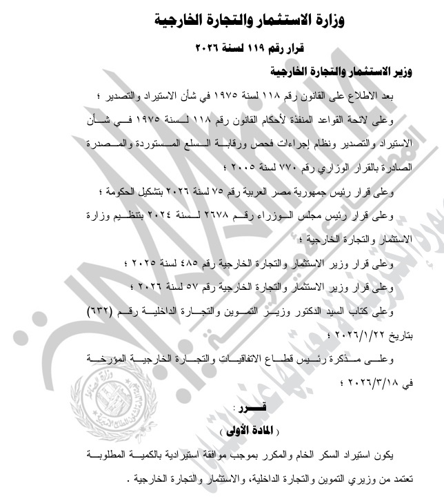 قامت الجريدة الرسمية اليوم الأربعاء، 1 إبريل 2026، في العدد رقم 72 تابع (أ)، بنشر قرار وزارة الاستثمار والتجارة الخارجية رقم 119 لسنة 2026، بشأن تنظيم استيراد وتصدير السكر.