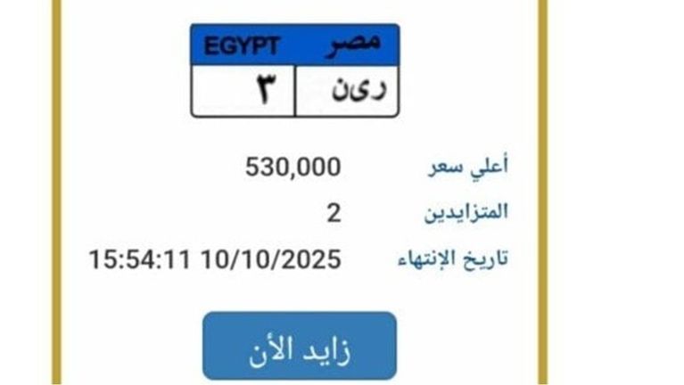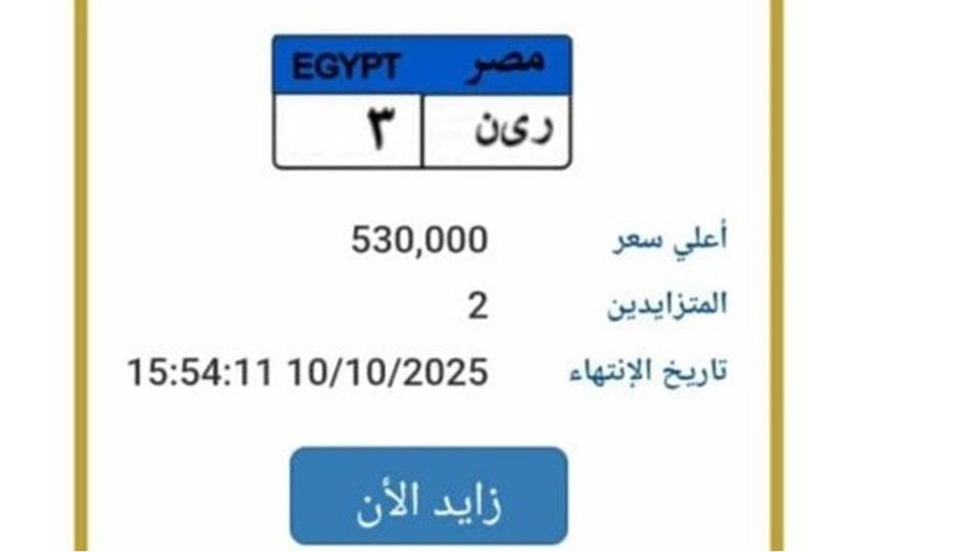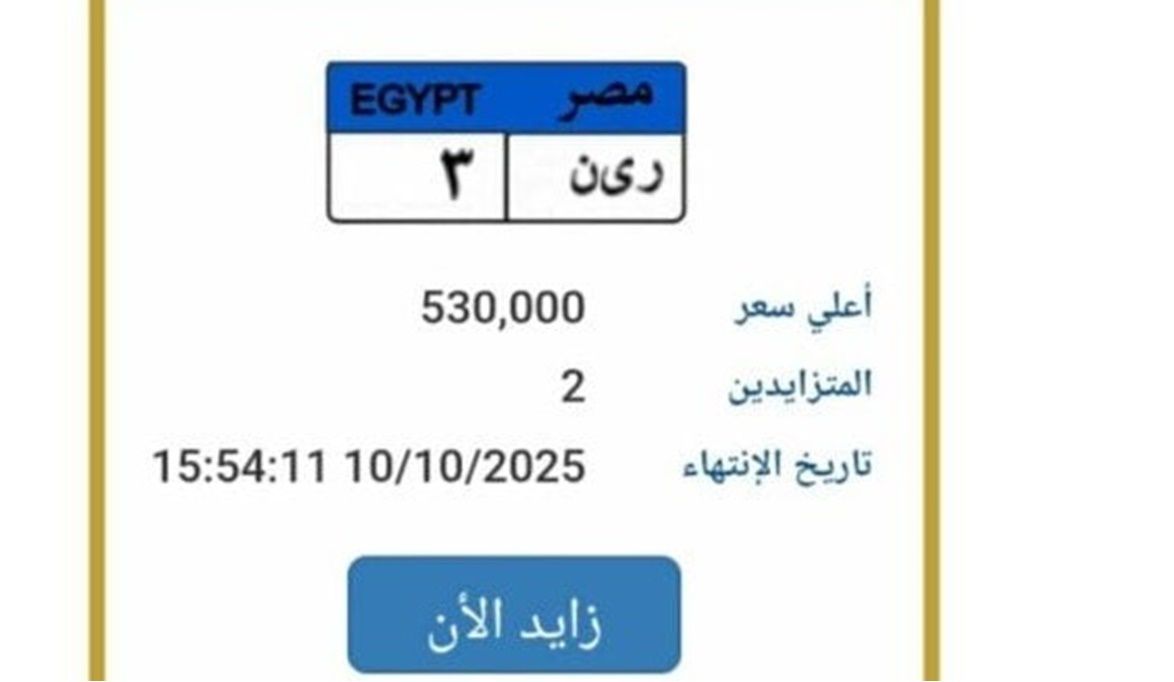 أعلنت بوابة مرور مصر الإلكترونية، المزايدة على لوحة معدنية مميزة للسيارات، وصل سعرها إلى 530 ألف جنيه، وتحمل رقم «ر ى ن 3»، ويتزايد عليها حتى الآن شخصان، ومن المقرر أن تنتهي المزايدة عليها يوم الجمعة الموافق 10 أكتوبر 2025.