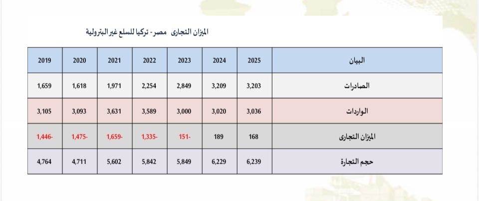 وأشار النجار إلى أن الواردات من تركيا شهدت ارتفاعًا تدريجيًا خلال السنوات الماضية، لتصل إلى 3.036 مليارات دولار في 2025، مقارنة بـ 3.105 مليارات دولار في 2024، مع تسجيل انخفاض طفيف في بعض السنوات نتيجة التوازن التجاري والتغيرات في أنماط الاستيراد داخل السوق التركية.