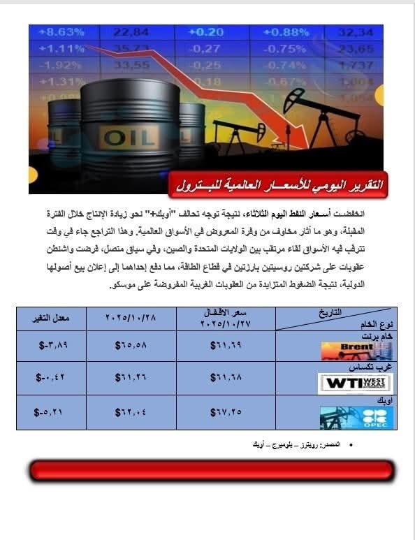 نشرت الهيئة المصرية العامة للبترول عبر صفحتها الرسمية على مواقع التواصل الاجتماعي، اليوم الثلاثاء الموافق 29 أكتوبر 2025، التقرير اليومي لوزارة البترول بشأن الأسعار العالمية للبترول، والذي كشف عن تراجع ملحوظ في أسعار النفط الخام خلال تعاملات اليوم.