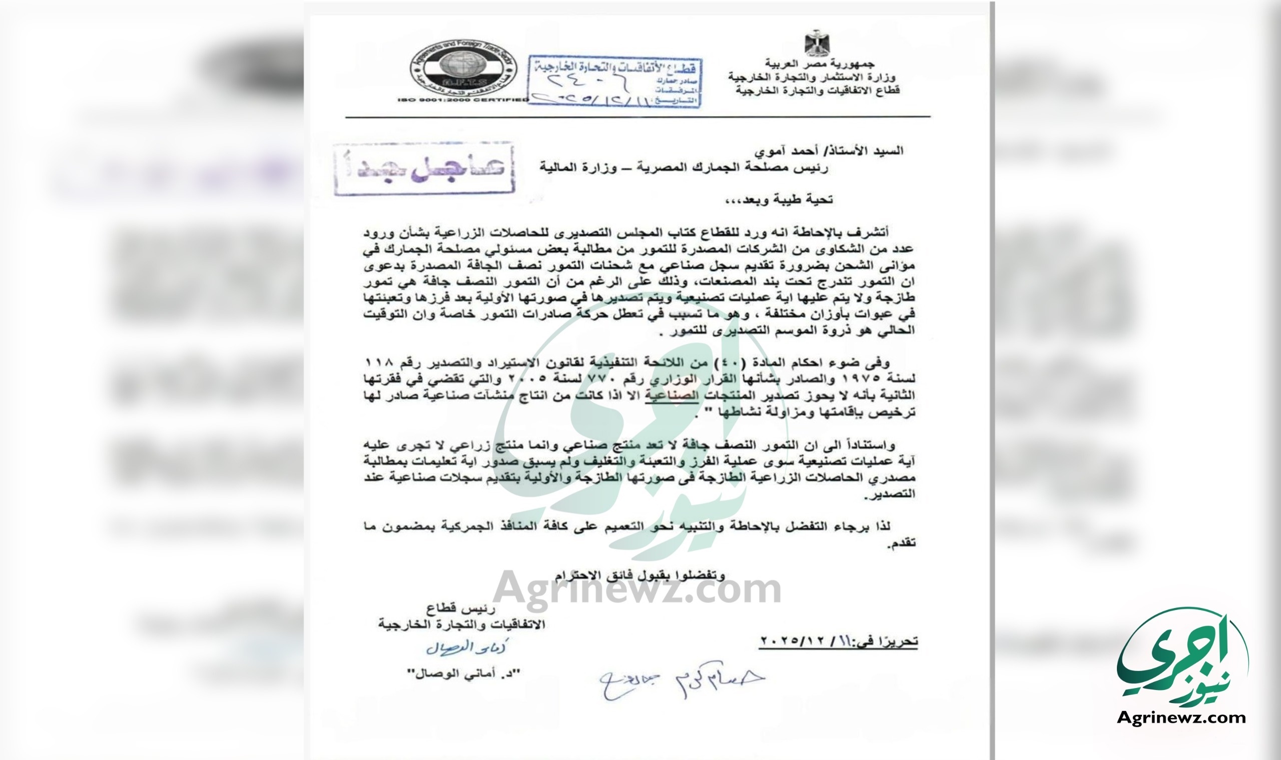 هذا الوضع دفع قطاع الاتفاقيات والتجارة الخارجية إلى إصدار مذكرة عاجلة لرئيس مصلحة الجمارك، مستندًا إلى القوانين المنظمة للتصدير، لتوضيح أن التمور النصف جافة لا تصنف كمنتجات صناعية، وبالتالي لا يلزمها تقديم سجل صناعي عند التصدير.