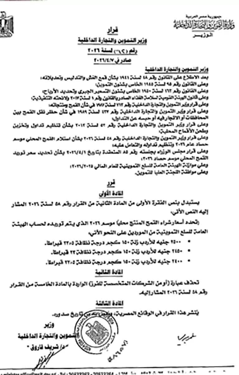 أصدر الدكتور شريف فاروق وزير التموين والتجارة الداخلية قرارًا جديدًا بشأن أسعار شراء القمح المحلي لموسم حصاد عام 2026، وذلك بعد الاطلاع على القوانين المنظمة لشئون التموين والغلال وسلامة الغذاء، وموافقة اللجنة العليا للتموين، ومراعاة موازنة الهيئة العامة للسلع التموينية للعام المالي 2025/2026.