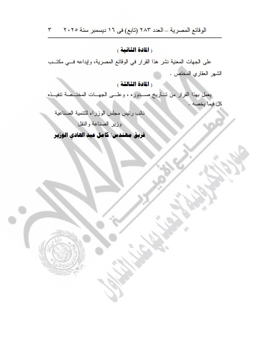 أما عن المادة الثانية، على الجهات المعنية نشر هذا القرار في الوقائع المصرية، وإيداعه في مكتب الشهر العقاري المختص.
