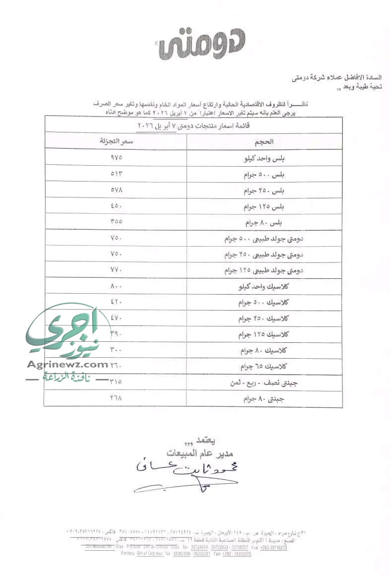 ارتفعت أسعار عبوات دومتي جولد طبيعي على النحو التالي: عبوة 500 و250 جرامًا من 730 إلى 750 جنيهًا، وعبوة 125 جرام من 755 إلى 770 جنيهًا، في ضوء مراجعة دورية للأسعار وفق تكاليف الإنتاج ومدخلات التشغيل.