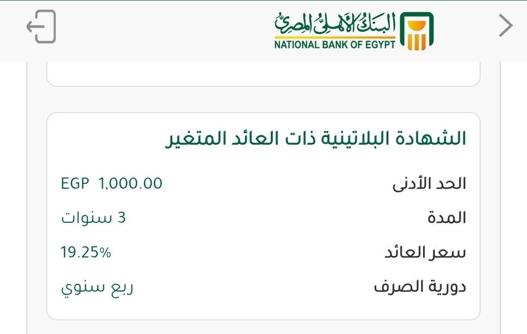 استثنائياً يتراوح بين 21% للدورية الشهرية و22% للدورية السنوية.وتظل هذه الأرقام الأعلى ضمن أسعار فائدة شهادات البنك الأهلي لمدة سنة كعائد للسنة الأولى، رغم انخفاض النسبة في السنوات التالية لتصل إلى 13% في السنة الثالثة، ما يوفر سيولة مرتفعة للمدخرين على المدى القريب.
