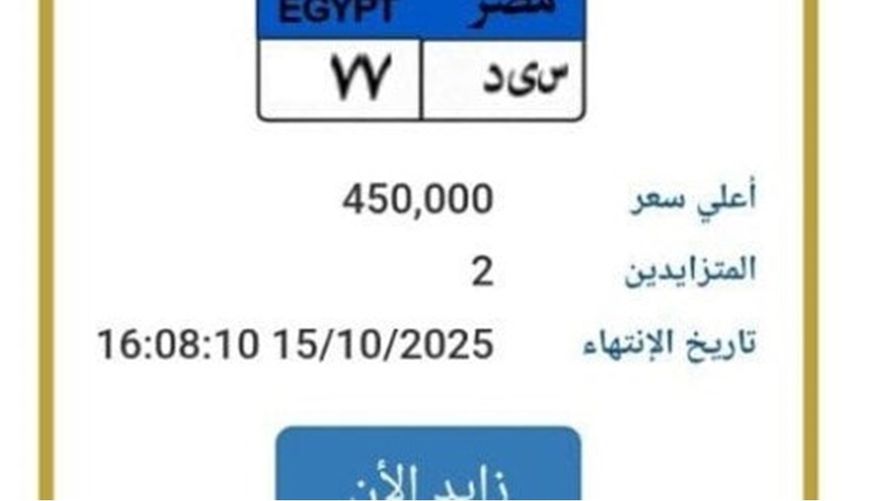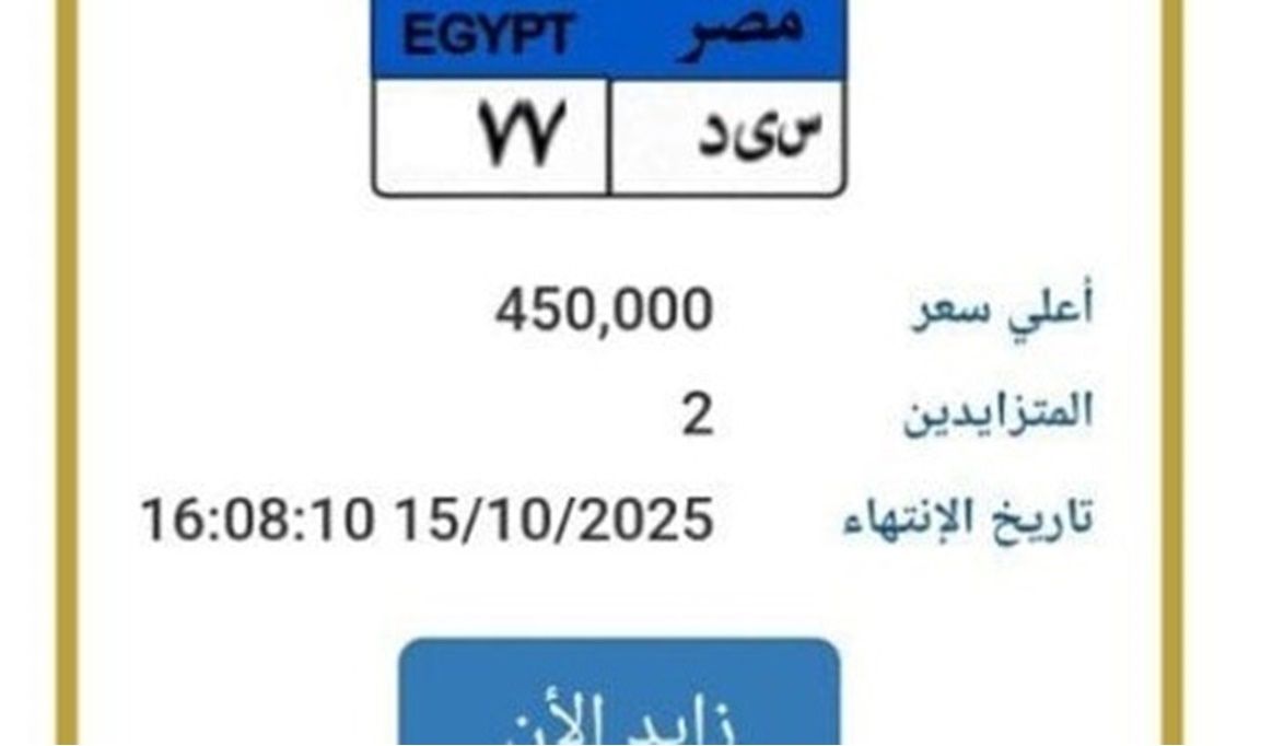 أعلنت بوابة مرور مصر الإلكترونية، المزايدة على لوحة معدنية مميزة للسيارات، وصل سعرها إلى 450 ألف جنيه، وتحمل رقم «س ى د 77»، ويتزايد عليها حتى الآن شخصين، ومن المقرر أن تنتهي المزايدة عليها يوم الأربعاء الموافق 15 أكتوبر 2025.