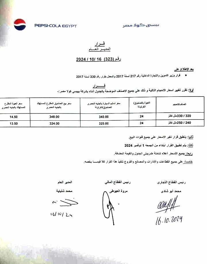 وبحسب منشور الشركة ، فإن الشركة رفعت سعر بيبسي "كانز" 330 ملي، إلى 14.5 جنيه، مقابل 11.75 جنيه قبل الزيادة، بارتفاع 2.75 جنيه.