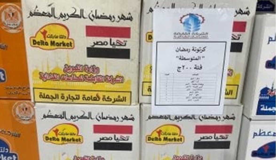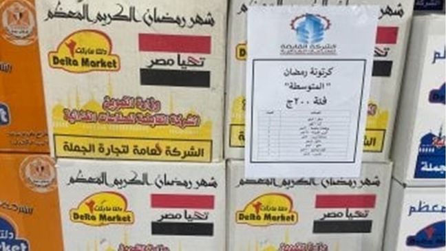 كرتونة بسعر 300 جنيه تشمل 10 أصناف: 2 كيلو سكر، 2 كيلو أرز، صلصة 300 جرام، 2 مكرونة 350 جرام، زيت 700 مل، 2 شاي 40 جرام، 2 ملح 300 جرام، كيلو بلح، فول 500 جرام، وسمنة 350 جرام.