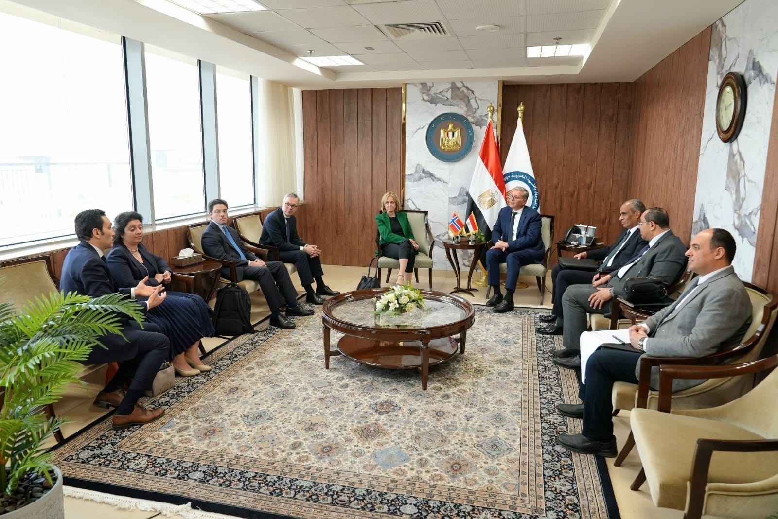 استقبل المهندس كريم بدوى وزير البترول والثروة المعدنية السيدة هيلدا كليميتسدال سفيرة النرويج لدى القاهرة وتيرجى بيلسكوج الرئيس التنفيذى لشركة سكاتك النرويجية والوفد المرافق حيث تم بحث سبل تعزيز التعاون بين قطاع البترول والشركة النرويجية فى مجال الطاقة الخضراء فى ضوء المشروع المشترك الذى يتم تنفيذه حالياً لانتاج الأمونيا الخضراء بمحافظة دمياط.