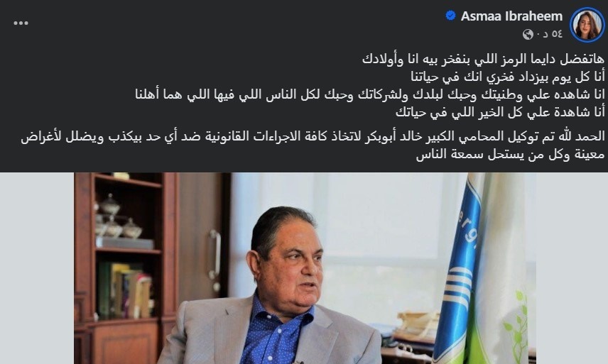 وفي بيان رسمي نشرته عبر صفحتها على فيسبوك، أكدت أسما إبراهيم على وطنيته وحبه لبلده وشركاته واهتمامه بكل الناس الذين يعتبرهم أهلًا له، مشيرة إلى أنها شاهدة على كل الخير في حياته وإسهاماته الاقتصادية والاجتماعية.