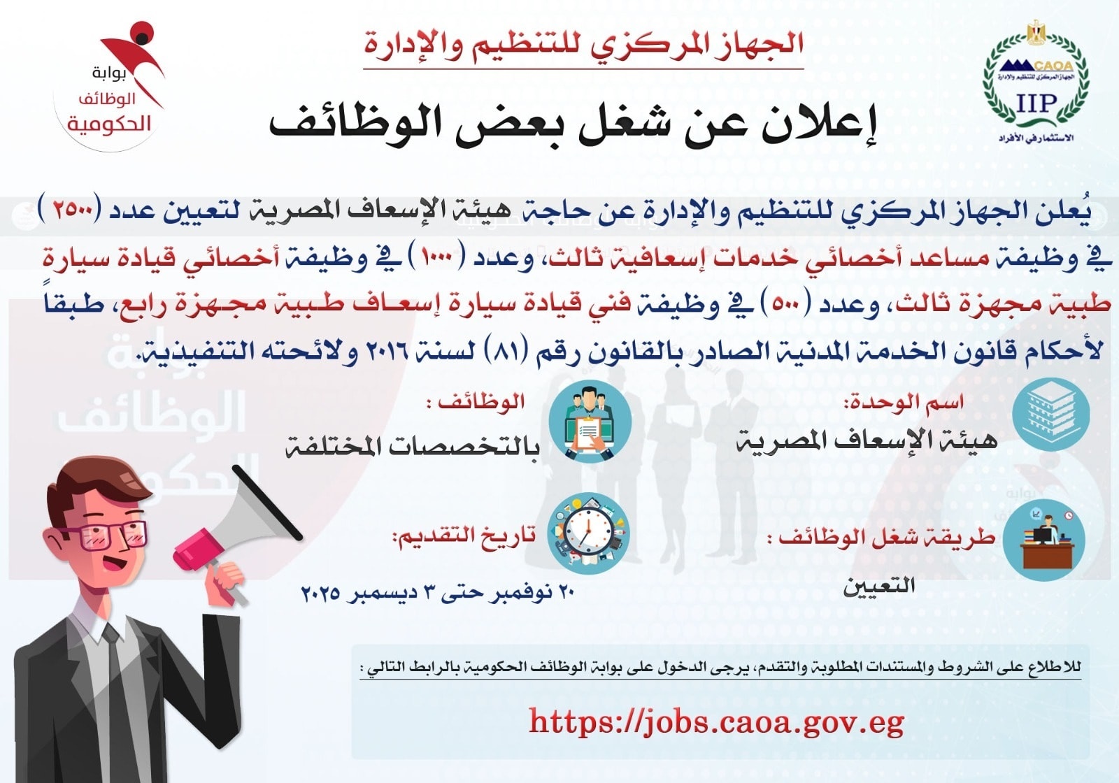 واختتم الجهاز المركزي للتنظيم والإدارة بيانه بالتأكيد على أن هذه المسابقة تأتي في إطار خطة الدولة لتوفير فرص عمل للشباب المؤهلين، وتحسين مستوى الخدمات الإسعافية في جميع محافظات الجمهورية.