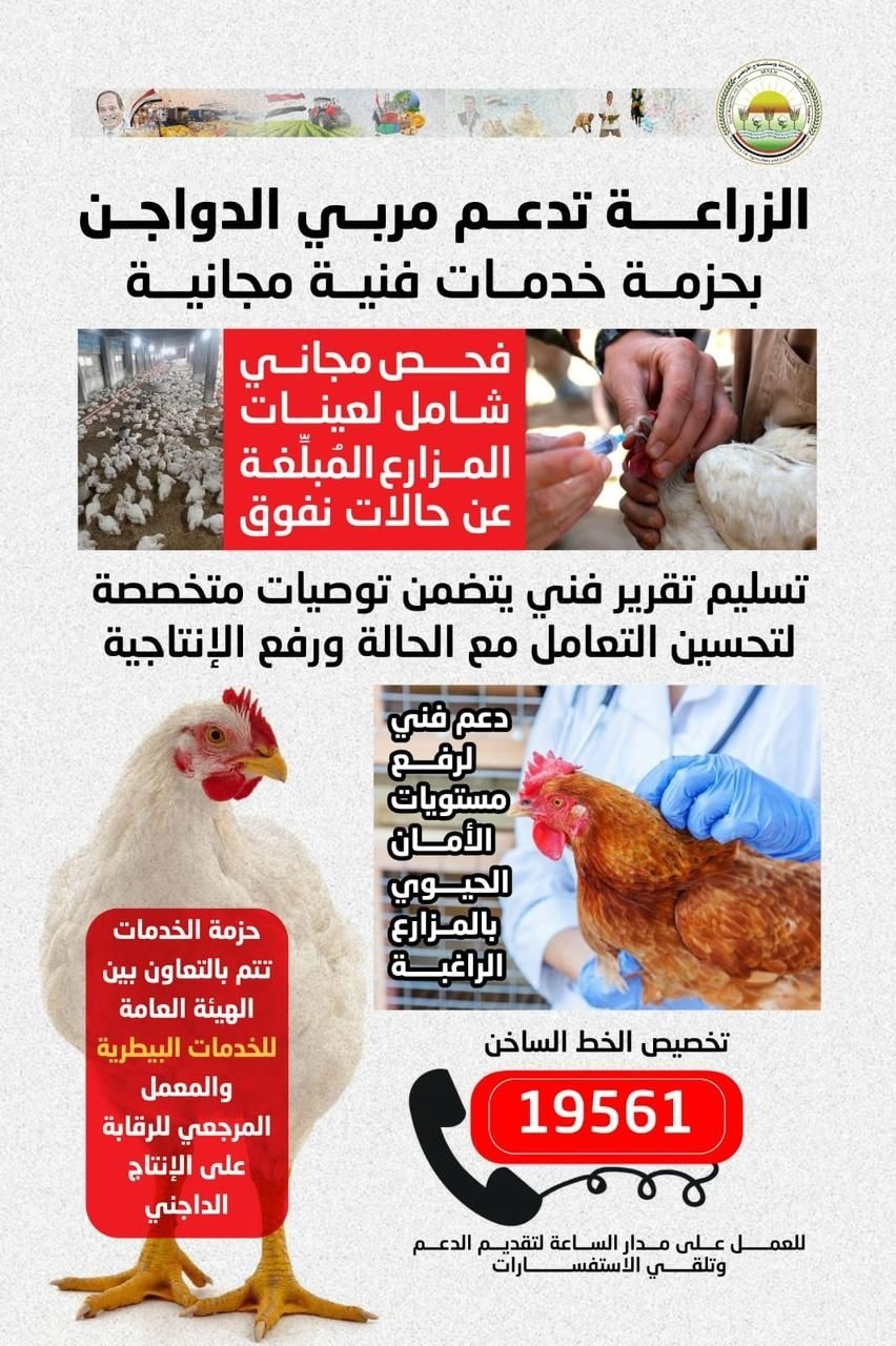 تشمل الحزمة الجديدة إجراء فحص معملي مجاني لجميع العينات المبلغة عن حالات نفوق الدواجن في المزارع.