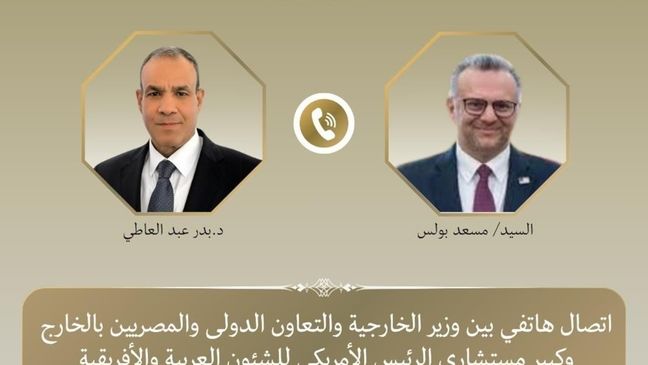 جرى اتصال هاتفي بين د. بدر عبد العاطي وزير الخارجية والتعاون الدولي والمصريين بالخارج، “مسعد بولس” كبير مستشاري الرئيس الأمريكي للشئون العربية والأفريقية يوم الخميس ٢ ابريل، في إطار التنسيق والتشاور المستمر بين مصر والولايات المتحدة.