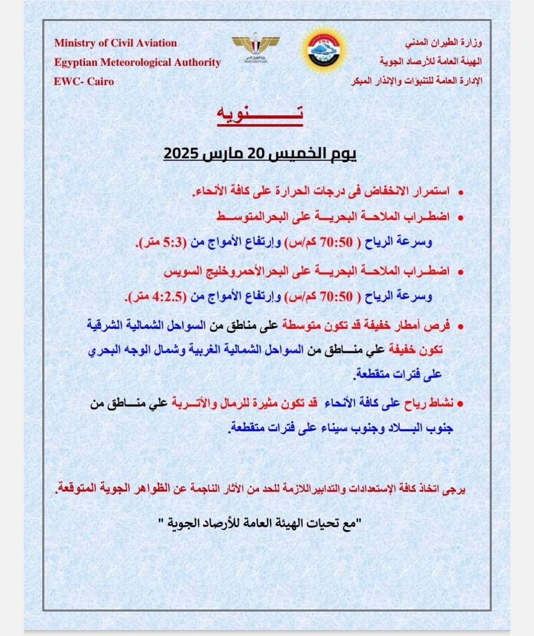 تتوقع الهيئة العامة للأرصاد الجوية، أن يشهد غدًا الخميس 20 مارس 2025 الموافق 20 رمضان، استمرار الانخفاض فى درجات الحرارة على كافة الأنحاء، واضطراب فى الملاحة البحرية على البحرين المتوسط والأحمر وخليج السويس، ليسود طقس معتدل نهارا على شمال البلاد حتى شمال الصعيد، مائل للحرارة على جنوب الصعيد ، بارد ليلا وفى الصباح الباكر على أغلب الأنحاء .