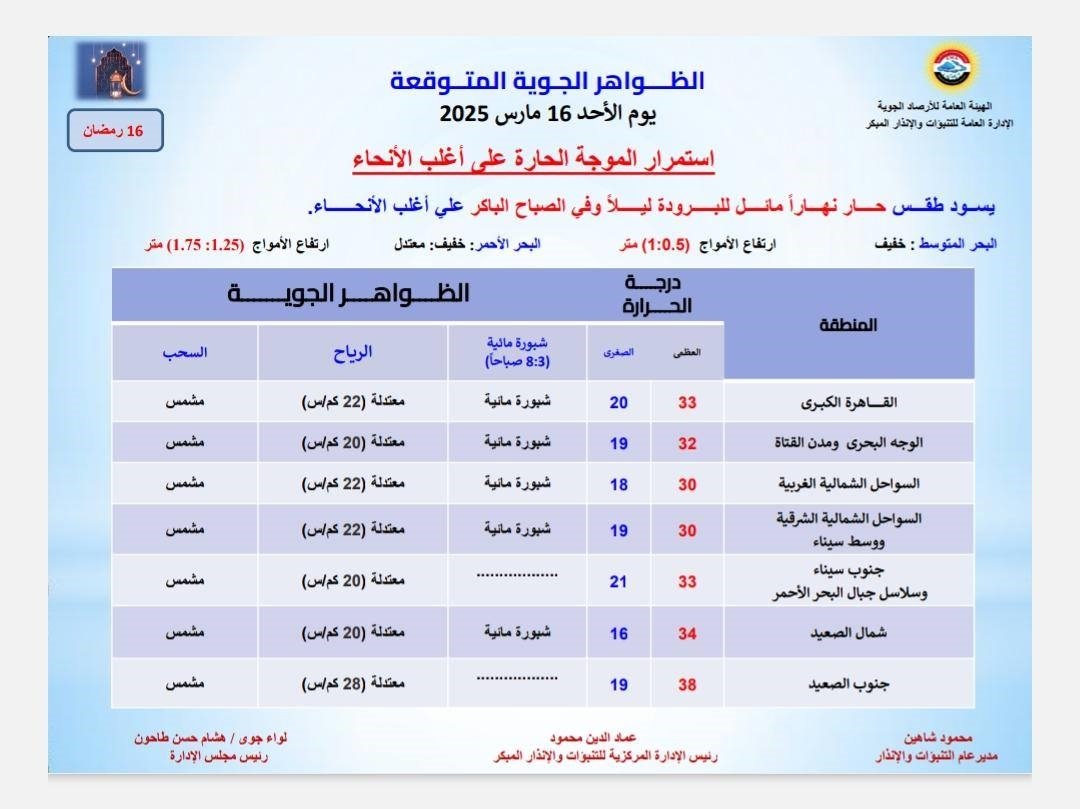تتوقع الهيئة العامة للأرصاد الجوية، أن يشهد اليوم الأحد 16 مارس 2025 الموافق 16 رمضان، ارتفاعا فى درجات الحرارة واستمرار الموجة الحارة على أغلب الأنحاء، ليسود طقس حار نهارا مائل للبرودة ليلاً وفى الصباح الباكر على أغلب الأنحاء.