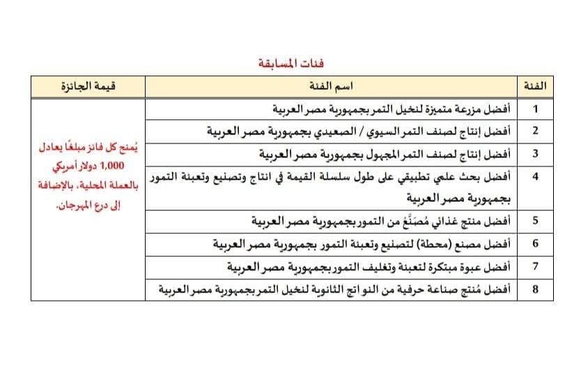 تهدف المسابقة إلى دعم وتنمية قطاع النخيل وإنتاج التمور في مصر، وتشجيع المزارعين والمصنعين والمصدرين على تطوير منتجاتهم وتحسين جودة التمور، بما يسهم في زيادة القيمة المضافة للتمور المصرية ورفع تنافسيتها في الأسواق الإقليمية والدولية.