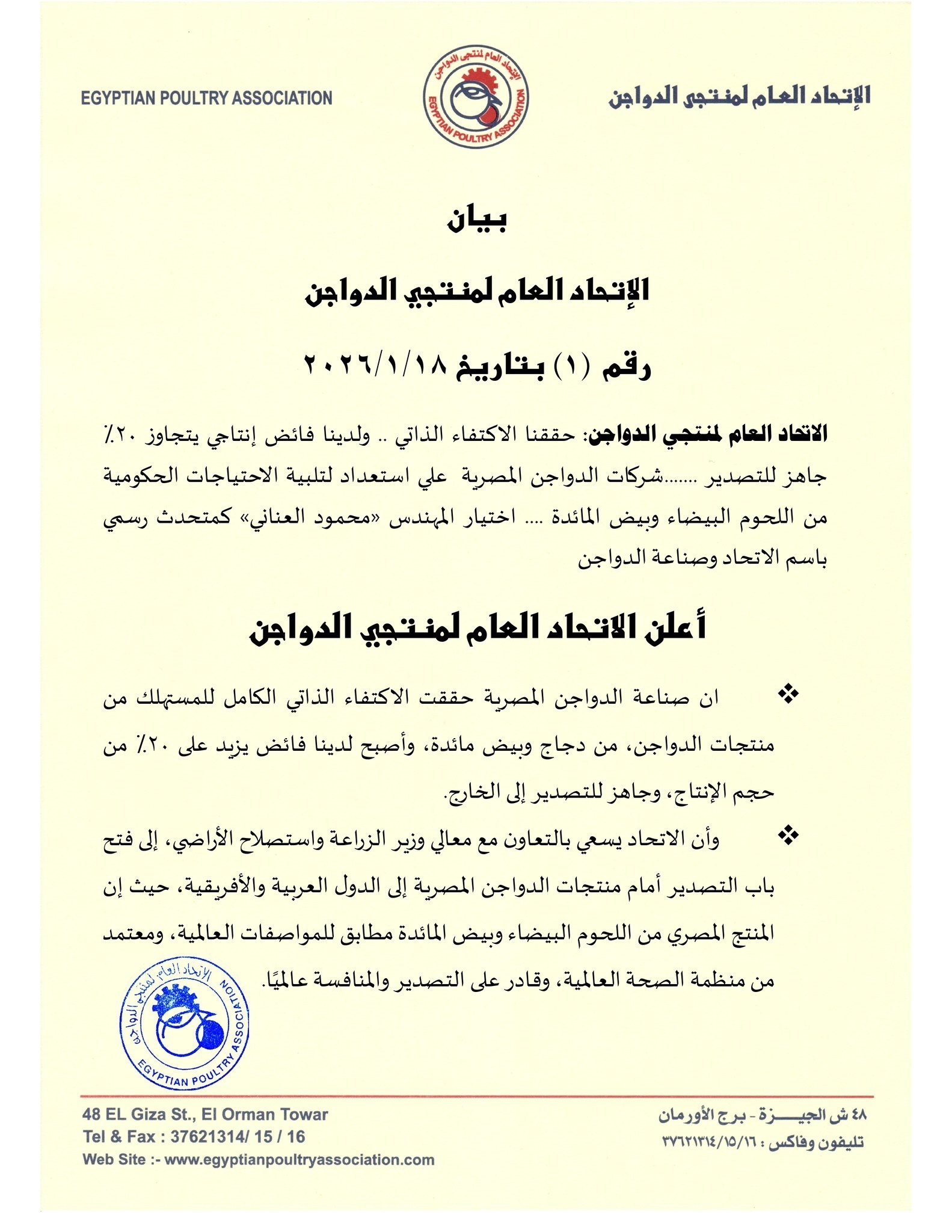 عيّن الاتحاد المهندس محمود العناني كمتحدث رسمي باسم صناعة الدواجن، ويملك الحق في تفويض أي من أعضاء الاتحاد لنقل أي بيانات رسمية، لضمان تقديم المعلومات بدقة وشفافية للرأي العام.
