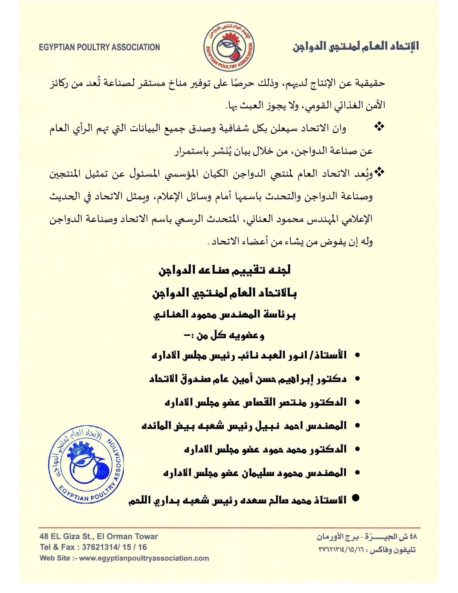 تتكون لجنة تقييم صناعة الدواجن بالاتحاد من نخبة من الخبراء، برئاسة المهندس محمود العناني، وعضوية: