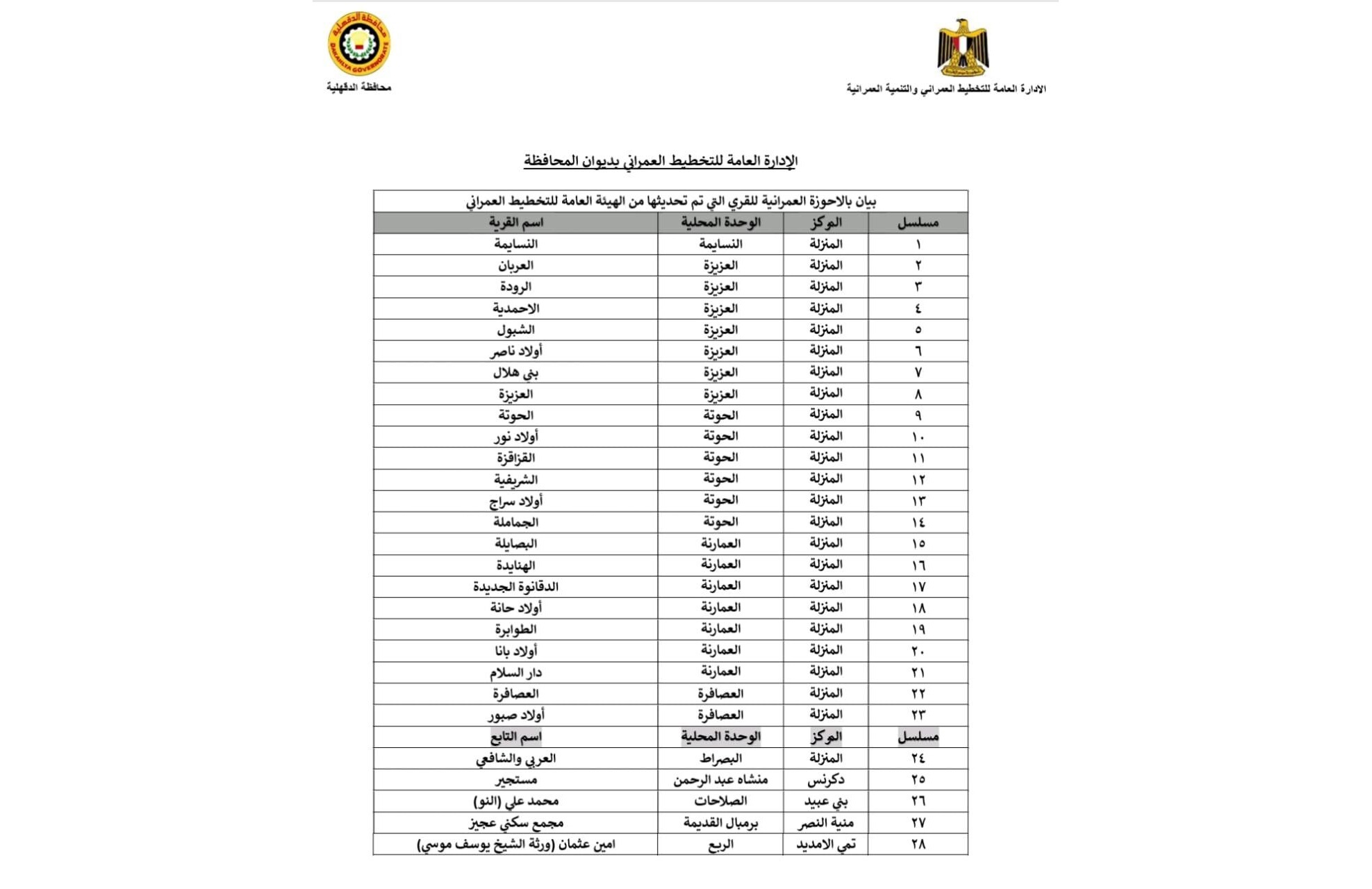 أعلن اللواء طارق مرزوق، محافظ الدقهلية، عن اعتماد الأحوزة العمرانية لـ 28 قرية وعزبة في عدد من مراكز المحافظة، وذلك ضمن خطة تطوير شاملة لتحسين البنية التحتية في المحافظة. تشمل الأحوزة العمرانية 23 قرية بمركزي المنزلة و المطرية، بالإضافة إلى 5 عزب في مراكز المنزلة، دكرنس، بني عبيد، منية النصر، و تمي الأمديد.