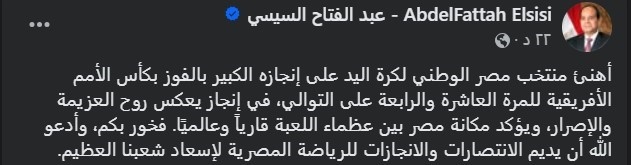 قال الرئيس عبر حساباته الرسمية على مواقع التواصل الاجتماعي: "فخور بكم، وأدعو الله أن يديم الانتصارات والإنجازات للرياضة المصرية لإسعاد شعبنا العظيم".مصر تتوّج باللقب بعد فوز ساحق على تونس
