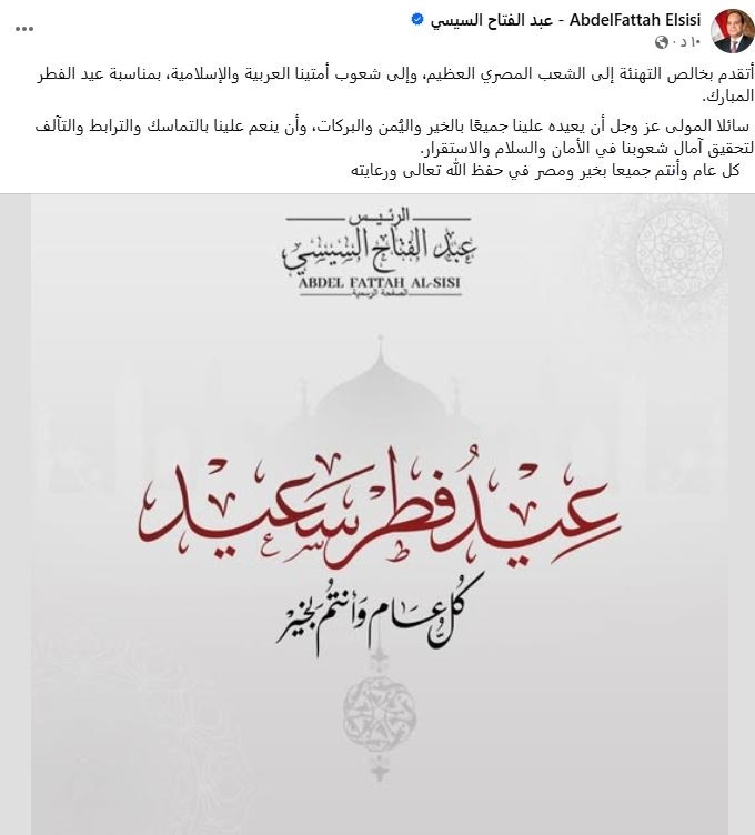 هنأ الرئيس عبد الفتاح السيسي الشعب المصري، وكذلك إلى شعوب الأمتين العربية والإسلامية، بمناسبة عيد الفطر المبارك، وذلك عبر صفحته الرسمية على موقع فيسبوك.