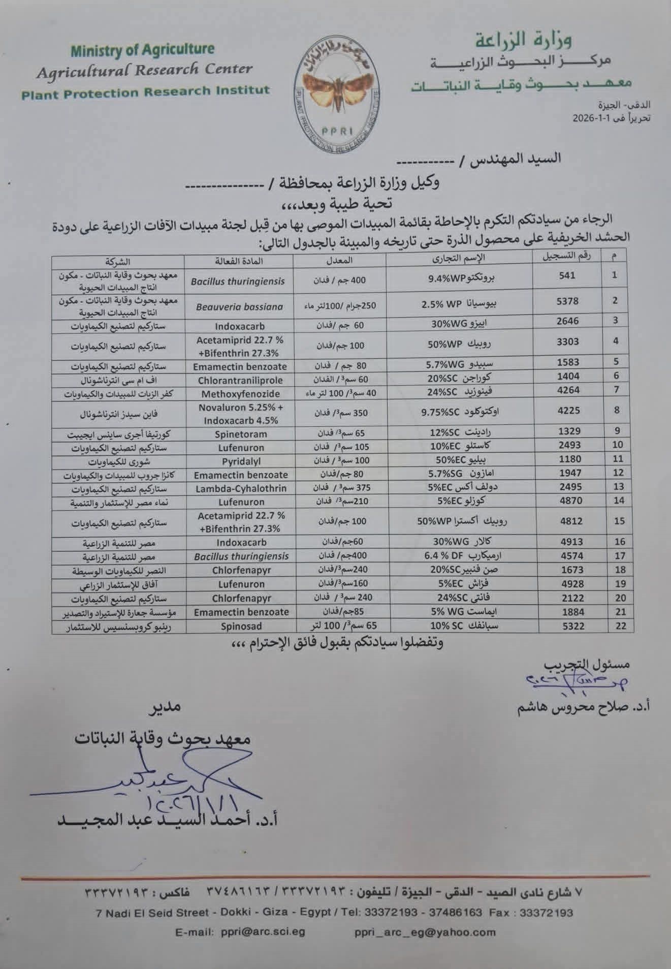 أصدر معهد بحوث وقاية النباتات التابع لمركز البحوث الزراعية بوزارة الزراعة تقريراً رسمياً يضم القائمة المحدثة للمبيدات الموصى بها لمكافحة دودة الحشد الخريفية على محصول الذرة، بهدف تعزيز حماية المحاصيل الاستراتيجية وضمان أعلى مستويات الكفاءة.