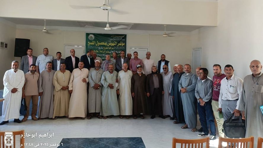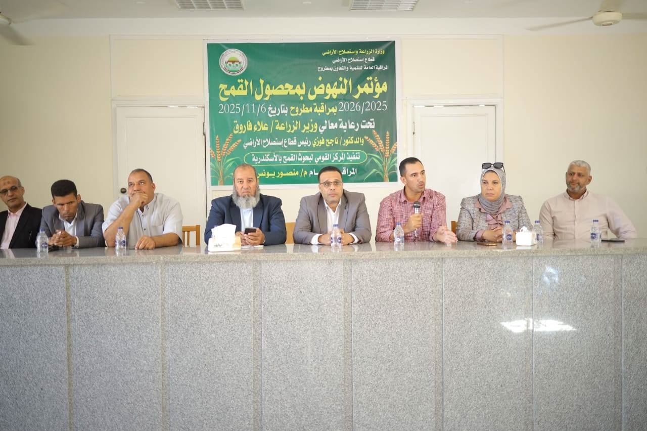 برعاية وزير الزراعة الأستاذ/ علاء فاروق، والأستاذ الدكتور/ عادل عبد العظيم رئيس مركز البحوث الزراعية، والأستاذ الدكتور/ حاتم الحمادي رئيس الإدارة المركزية للمحطات، والأستاذ الدكتور/ ناجج فوزي رئيس قطاع إستصلاح الأراضي، والأستاذة الدكتورة/ مها بلبع المنسق الإقليمي بالنوبارية، والدكتور/ أسعد رضا مدير محطة البحوث الزراعية بالنوبارية، تم اليوم الخميس 6 نوفمبر 2025 تنفيذ المؤتمر الإرشادي الأول للنهوض بمحصول القمح بمراقبة مطروح.