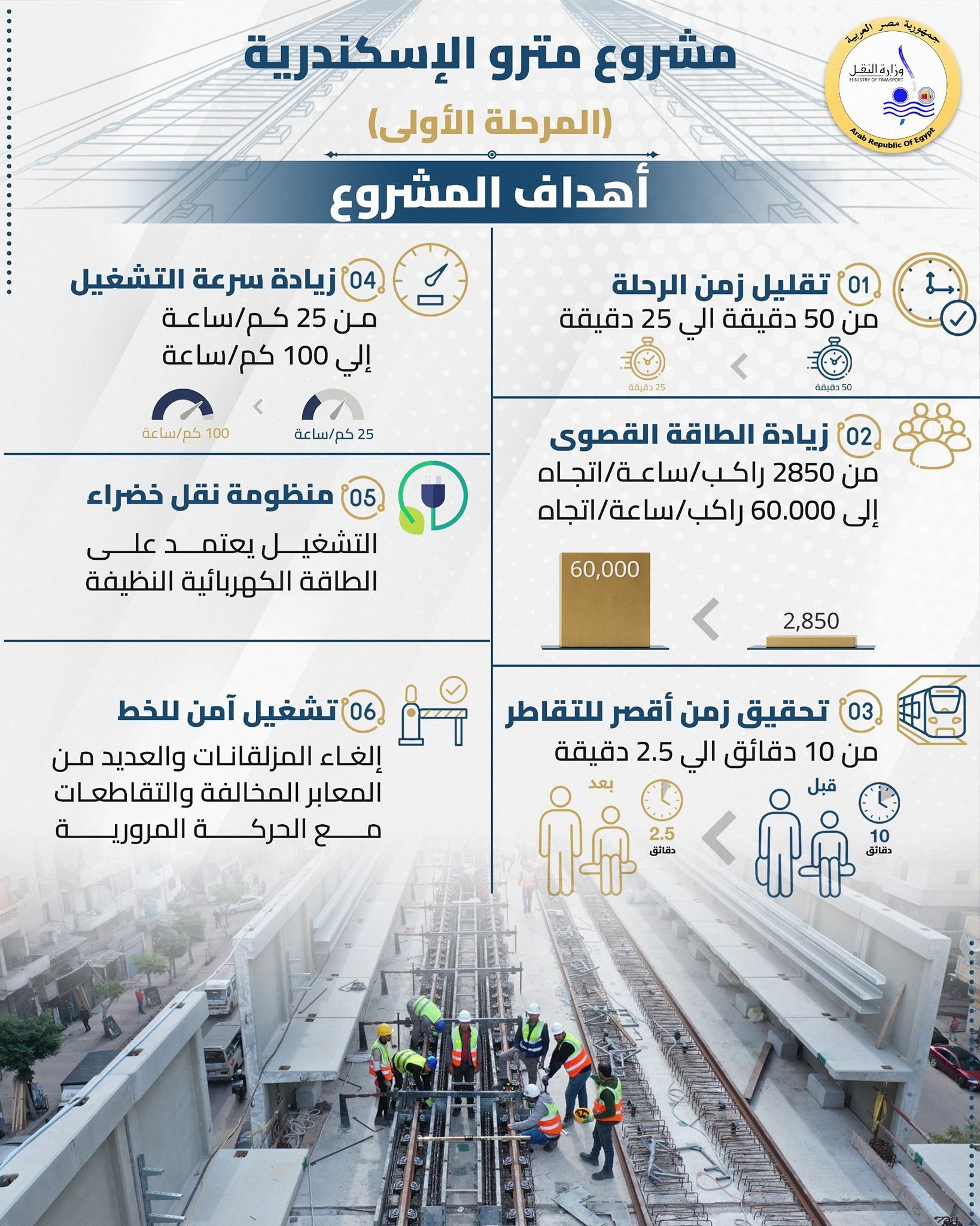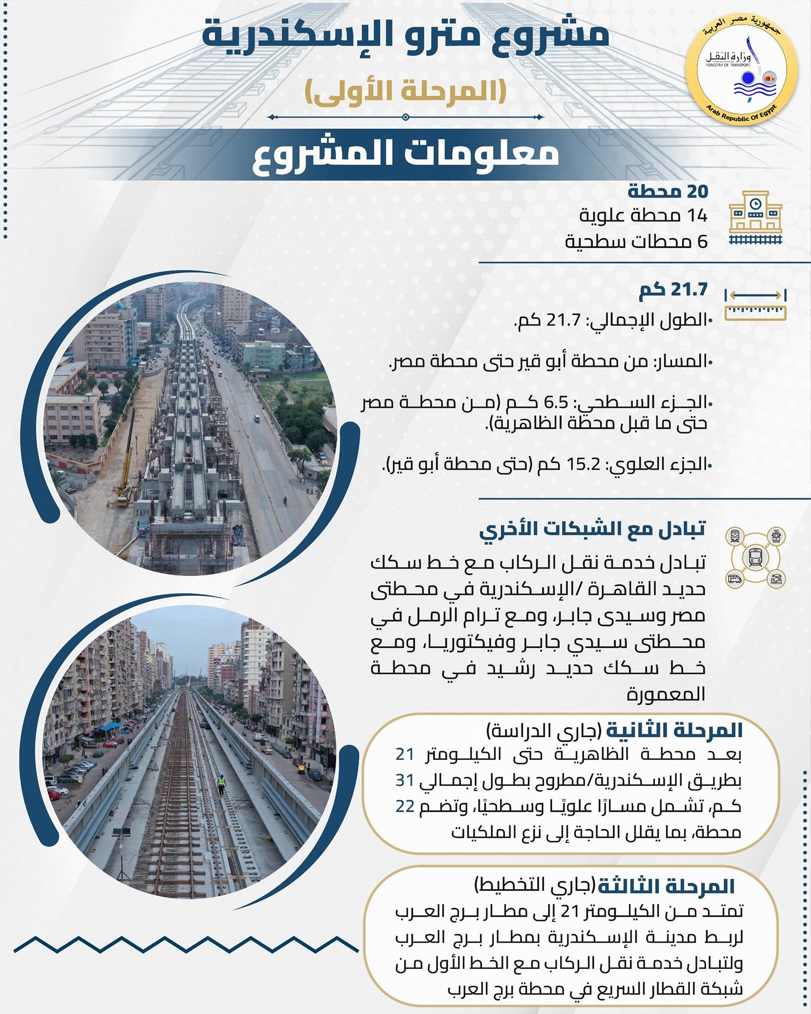أعلنت وزارة النقل عن تفاصيل مشروع مترو الإسكندرية في المرحلة الأولى، الذي يهدف إلى تحسين شبكة النقل العام في المدينة، والحد من الازدحام المروري، ويشمل المشروع إنشاء محطات سطحية وعلوية لتسهيل تنقل الركاب، مع توفير سرعة عالية و زمن تقاطر أقصر لتحقيق راحة أكبر للمواطنين.
