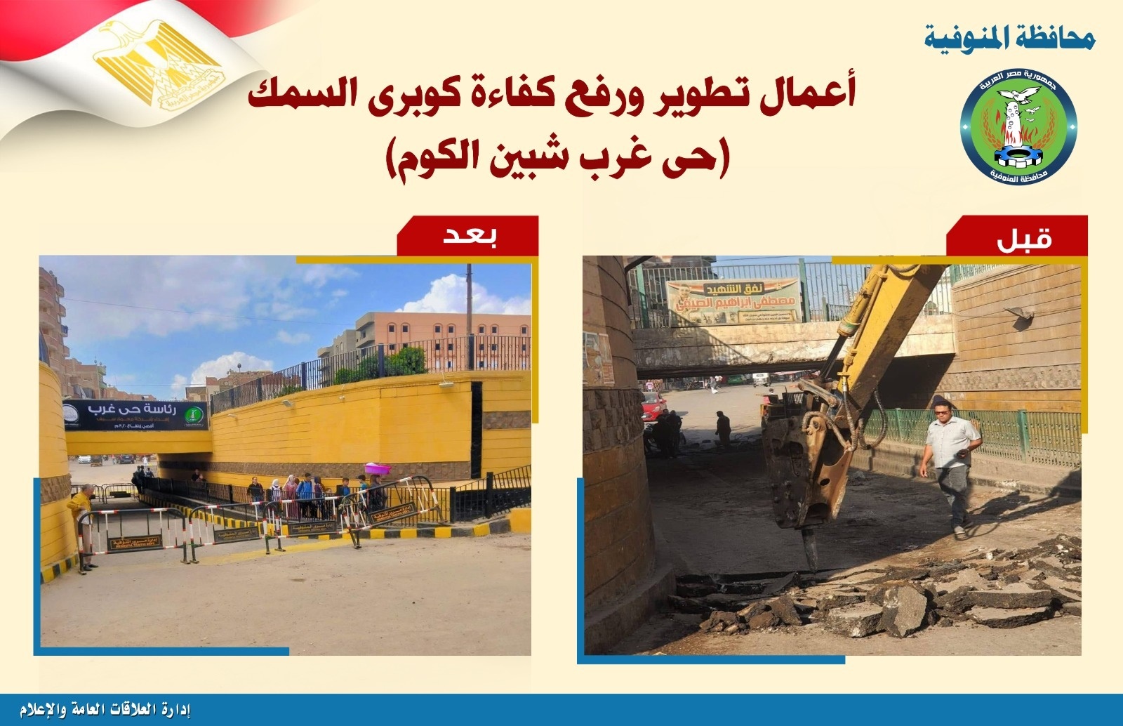 افتتح اليوم اللواء إبراهيم أبو ليمون محافظ المنوفية أعمال تطوير ورفع كفاءة نفق " كوبري السمك " بحي غرب شبين الكوم ، وذلك ضمن خطة المحافظة الشاملة لتطوير ورفع كفاءة الأنفاق وشبكات الطرق وتحسين كفاءة البنية التحتية وتطوير الخدمات بمختلف القطاعات الخدمية، تنفيذًا لتوجيهات القيادة السياسية بتحقيق التنمية الشاملة ورفع جودة الحياة المعيشية للمواطنين ، جاء ذلك بحضور اللواء عبد الله الديب السكرتير العام ، الأستاذ سيد شعبان رئيس حي غرب شبين الكوم ، المهندس أشرف طايل المستشار الهندسي للمحافظة.