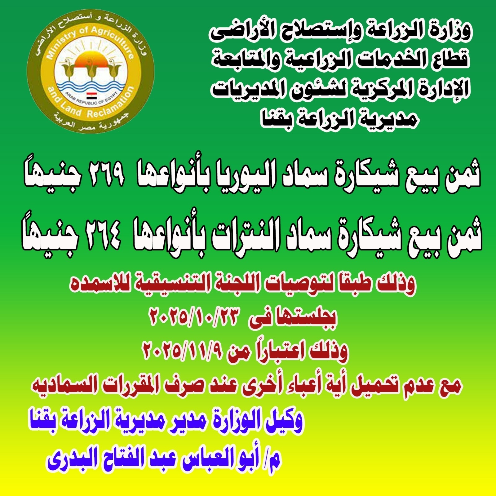 أعلنت وزارة الزراعة واستصلاح الاراضى، عن بدء صرف الاسمدة الزراعية الشتوية من 9 نوفمبر الجارى 2025، بالأسعار الرسمية لبيع شكائر الأسمدة المدعومة من نوعي اليوريا والنترات، وذلك تنفيذًا لتوصيات اللجنة التنسيقية للأسمدة بهدف ضبط منظومة التداول وضمان وصول الدعم إلى مستحقيه من المزارعين، سماد اليوريا بأنواعه: 269 جنيهًا للشكارة، سماد النترات بأنواعه: 264 جنيهًا للشكارة، اى بزيادة 5 جنيهات فى الشيكارة وهو تكاليف نقل الناولون تضاف على سعر الشيكارة القديم سماد النترات المدعم هو 259 جنيه، وسعر شيكارة سماد اليوريا المدعم هو 264 جنيه، وتؤكد وزارة الزراعة على أن الأسعار شاملة دون أي أعباء إضافية على المزارعين، مضيفاً أن الفرق البسيط في السعر (5 جنيهات) جاء فقط لتغطية نولون النقل والشحن نتيجة تحريك أسعار المحروقات.