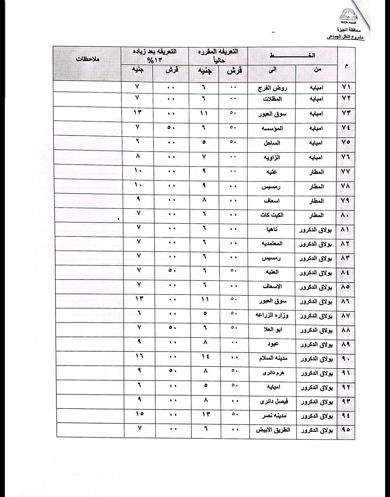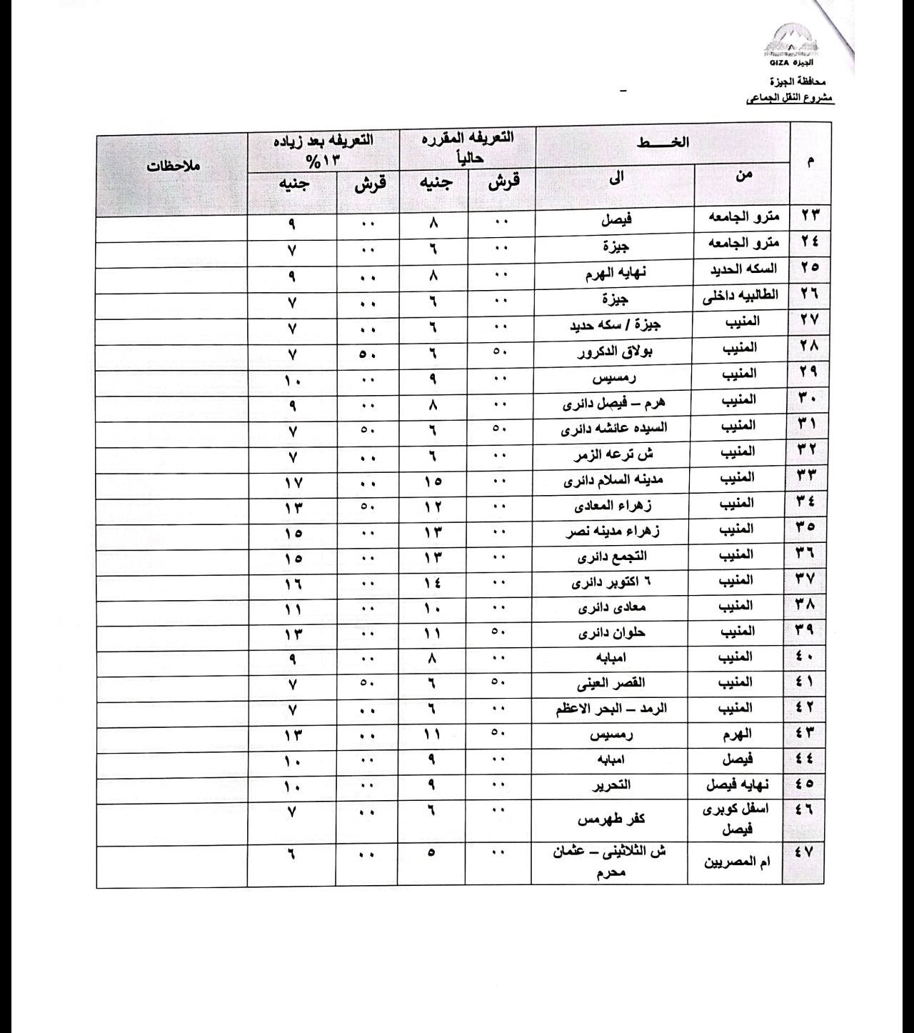 ووجه محافظ الجيزة الأجهزة المعنية من جهاز السرفيس وإدارة المرور ورؤساء الأحياء والمراكز ومسؤولي التموين، بالرقابة والمتابعة على مدار الساعة للتأكد من الإلتزام بالتعريفة الجديدة وعدم استغلال المواطنين.