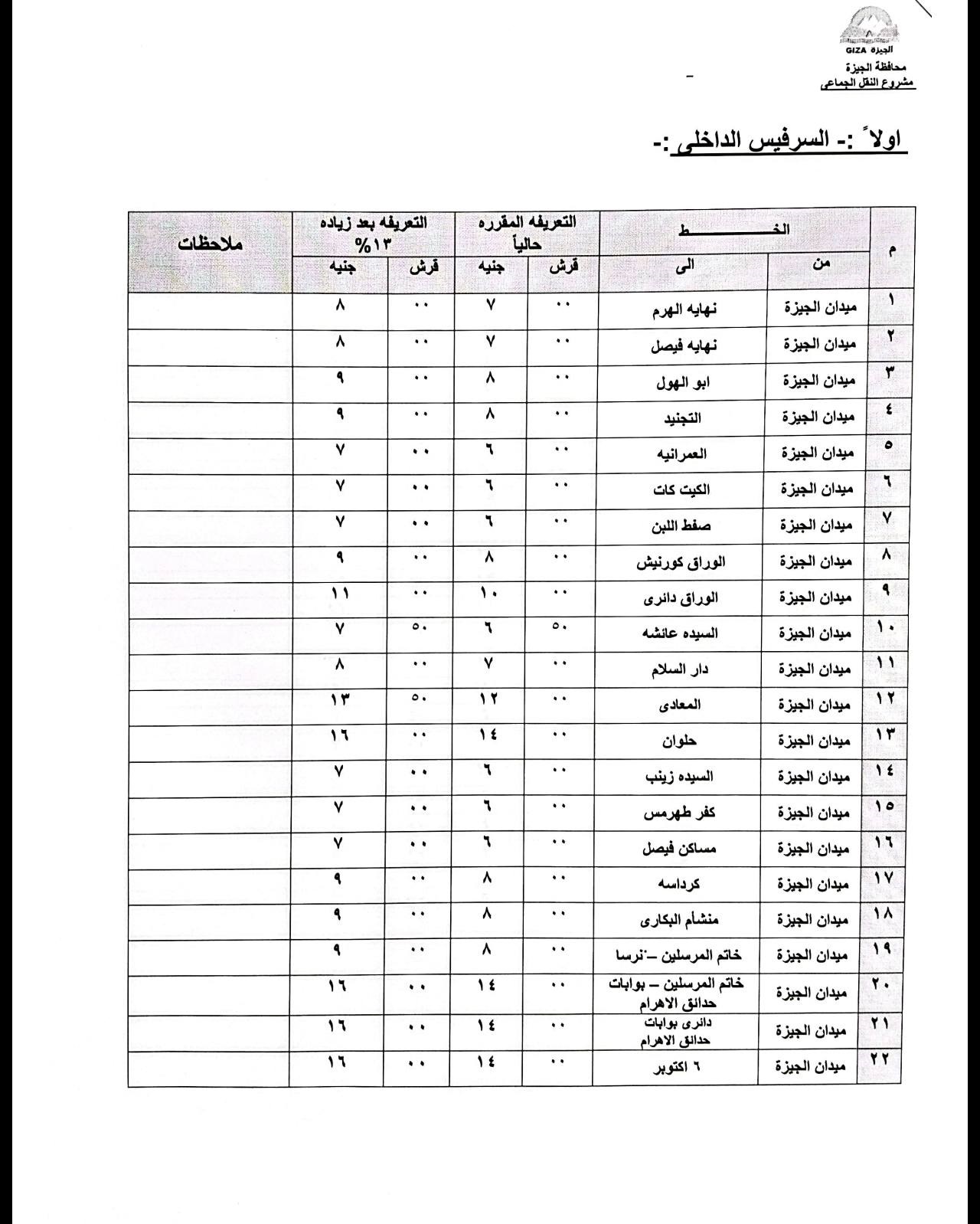 اعتمد المهندس عادل النجار محافظ الجيزة التعريفة الجديدة لسيارات السرفيس والنقل الجماعي الداخلية والخارجية والتي يتم تطبيقها اعتبارًا من اليوم الجمعة وطبقًا للجداول المرفقة وذلك في ضوء قرار لجنة التسعير التلقائي للمنتجات البترولية بوزارة البترول بتحريك أسعار المنتجات البترولية.