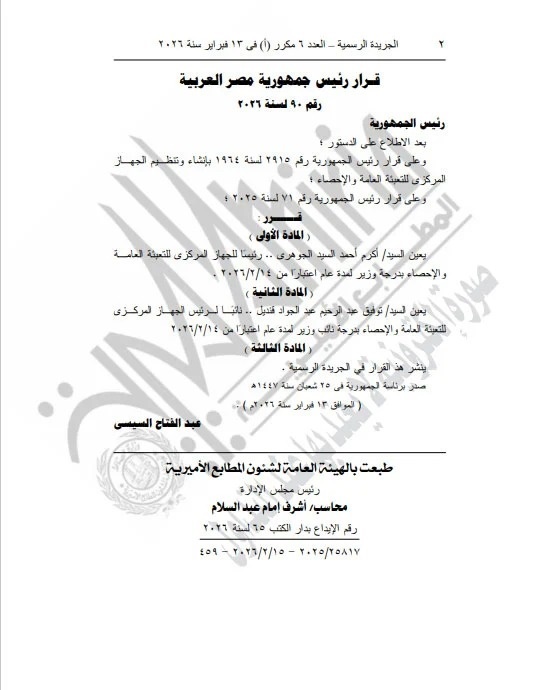 أصدر الرئيس عبد الفتاح السيسي القرار رقم 90 لسنة 2026، بتعيين أكرم أحمد السيد الجوهري رئيسًا للجهاز المركزي للتعبئة العامة والإحصاء بدرجة وزير، وذلك لمدة عام اعتبارًا من 14 فبراير 2026.