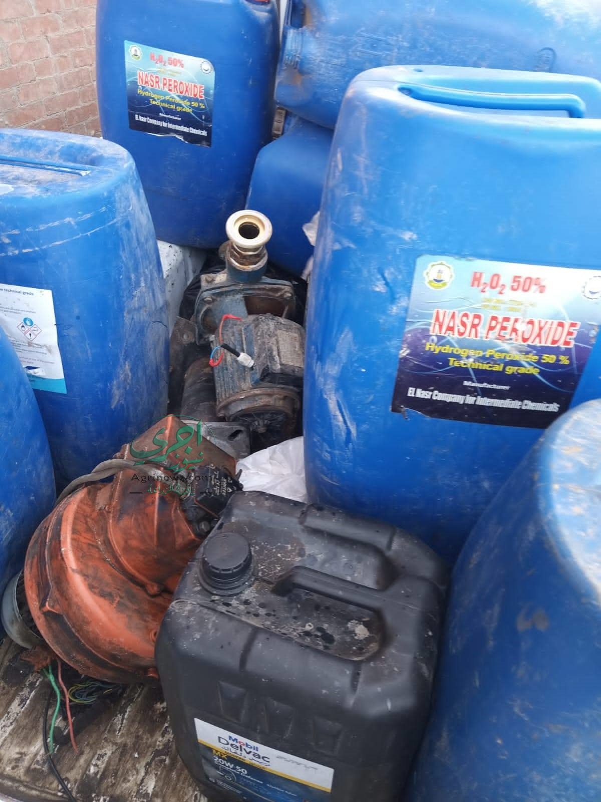 كما تم التحفظ على عدد من المعدات المستخدمة في التصنيع غير المشروع، شملت جركنات بلاستيكية فارغة، وخزان ستانلس، وموتورات كهربائية، وتروسيكلات، وخزان سعة 2 طن.