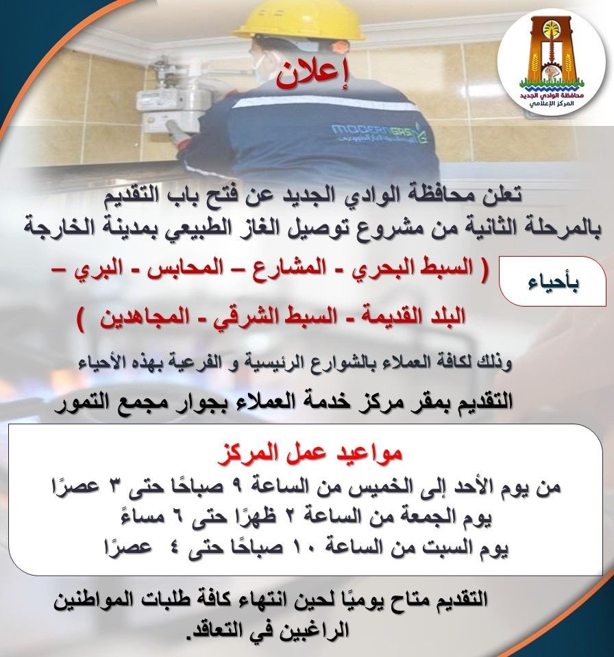 أعلن المركز الإعلامي لمحافظة الوادي الجديد، بالتعاون مع شركة MODERNGAS، عن فتح باب التقديم للمرحلة الثانية من مشروع توصيل الغاز الطبيعي للمنازل بمدينة الخارجة، وذلك في إطار جهود الدولة للتوسع في استخدام مصادر الطاقة النظيفة وتحسين مستوى الخدمات المقدمة للمواطنين.